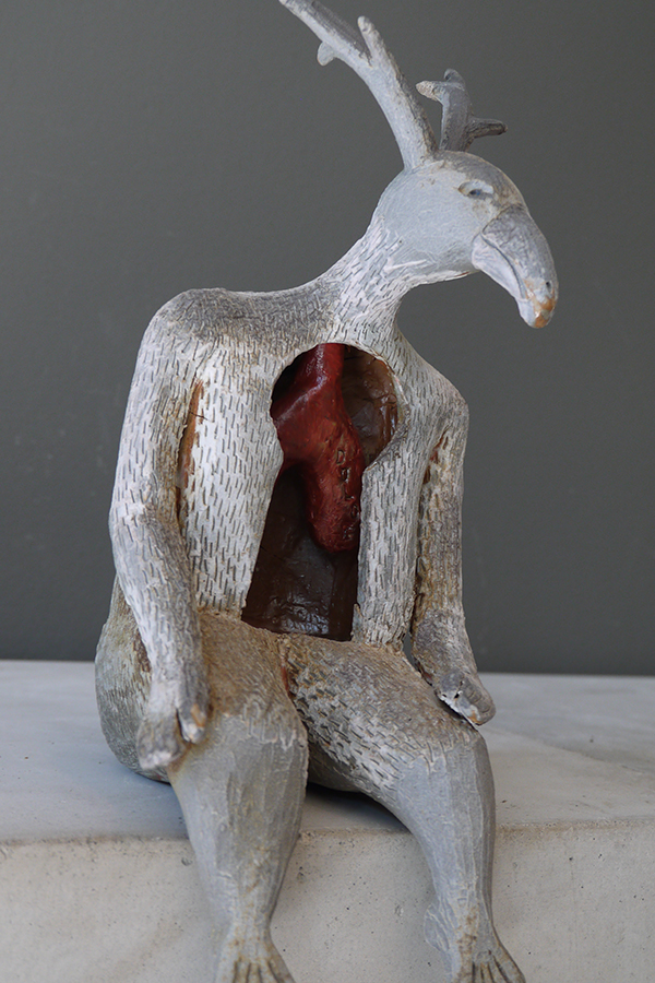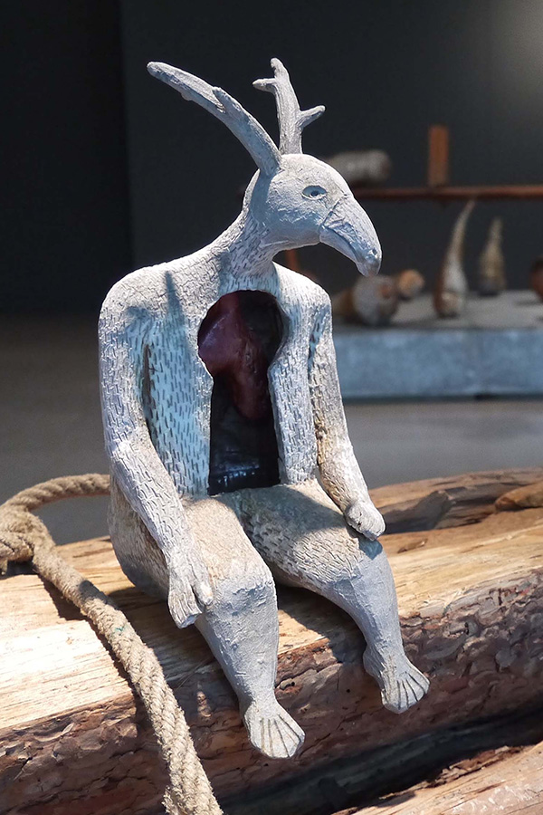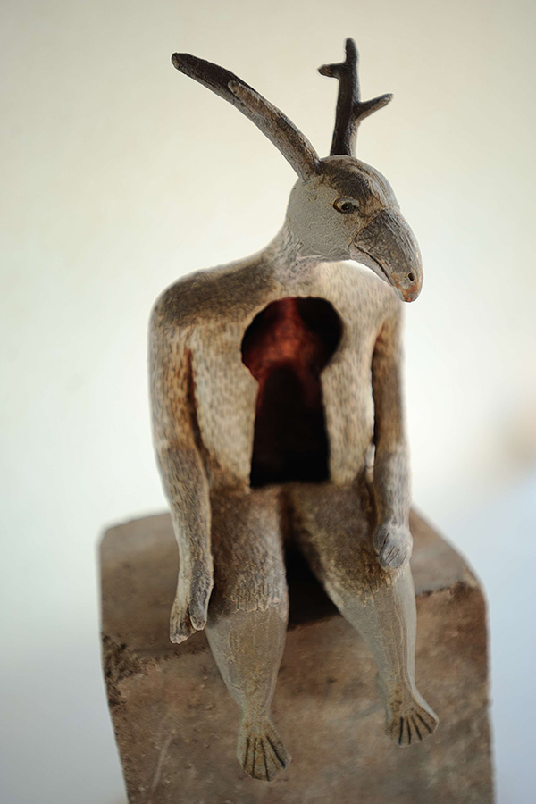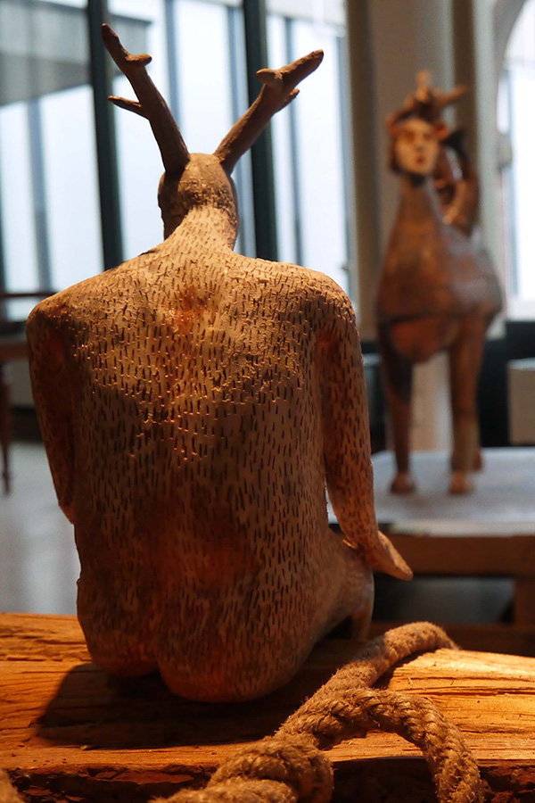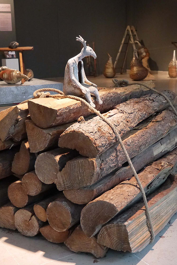 corpus de 3 sculptures mises en scène avec fagot de bois, bois de cerfs et sépulture antique.